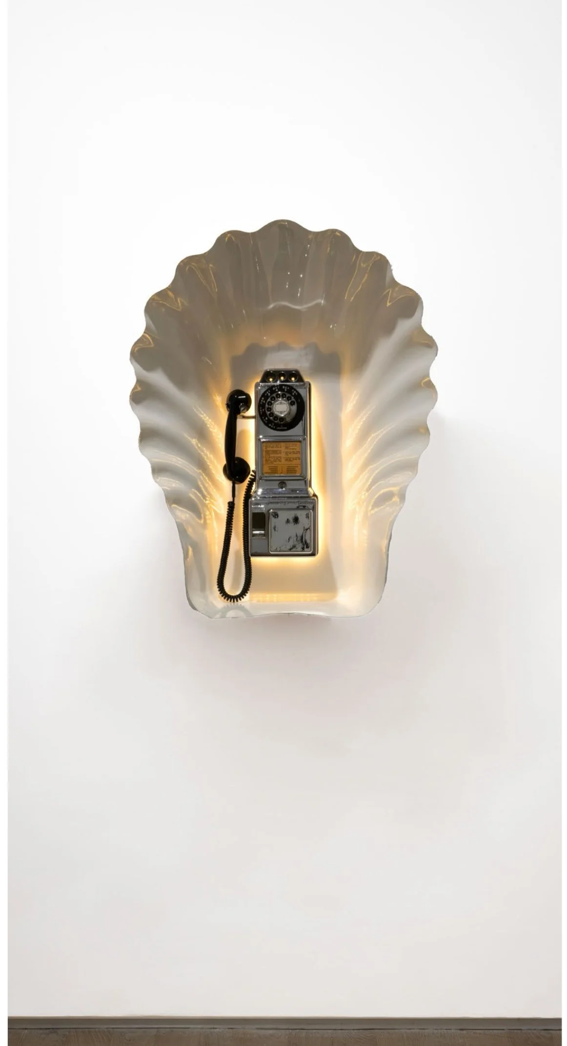 Ariana Papademetropoulos’s Glass Slipper at Thaddaeus Ropac Paris Marais invites us into a contemporary surrealist experience. An aquarium placed in the center of the space, calling the viewer to see the world through the eyes of fish, but also, a clam like telephone booth upstairs letting you phone ring our to the see. The dreamy mermaid landscape bubble is bordered nonetheless but a series of burning microwaves, heating up the atmosphere.